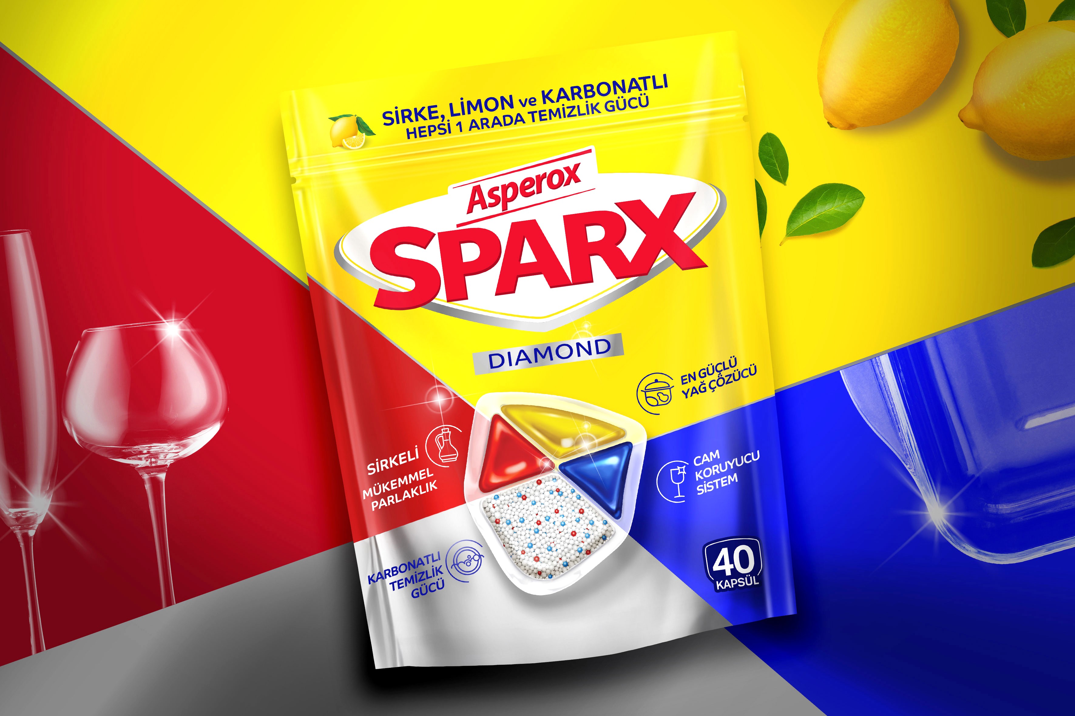 The journey began with the design of the Asperox Sparx Diamond dishwasher capsules. Inspired by the capsule’s iconic shape, the team placed it at the heart of the design, building a compelling visual world around it. This distinctive form also emphasizes the product’s four-phase formula, with each color highlighting a different functional benefit. The result is a clean yet bold visual language that stands out on shelves while communicating high performance.
