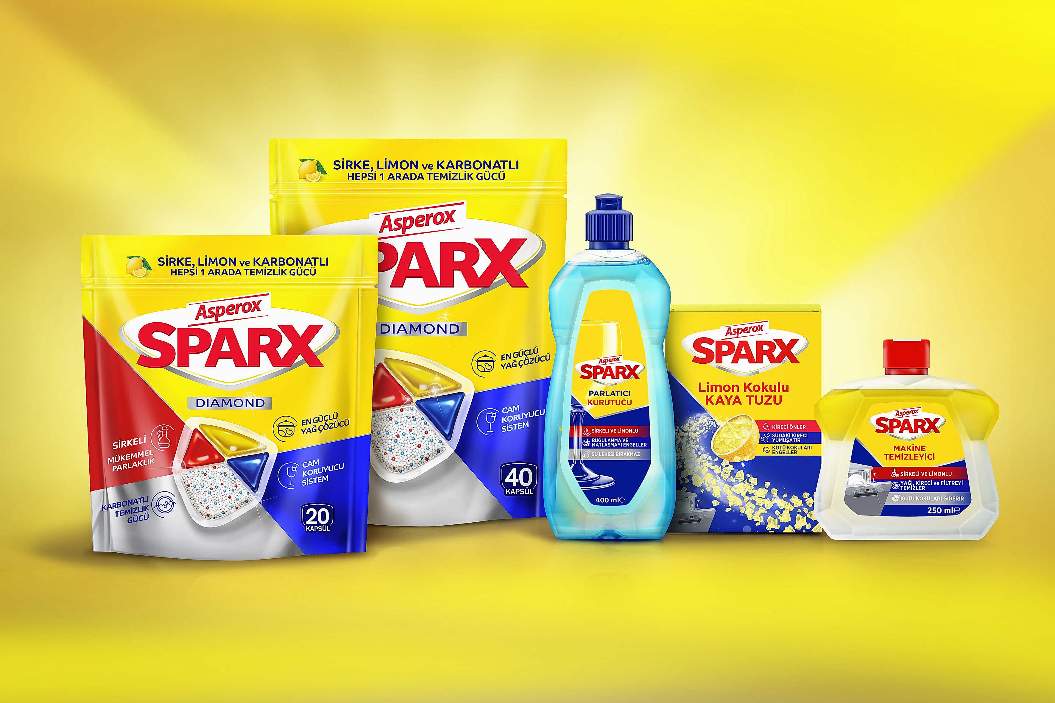 Celebrating its 20th anniversary in creative packaging design, Orhan Irmak Tasarım has created the packaging for the Asperox Sparx product line. Sparx includes a range of dishwasher products such as dishwasher tablets, machine cleaners, rinse aids and dishwasher salt.